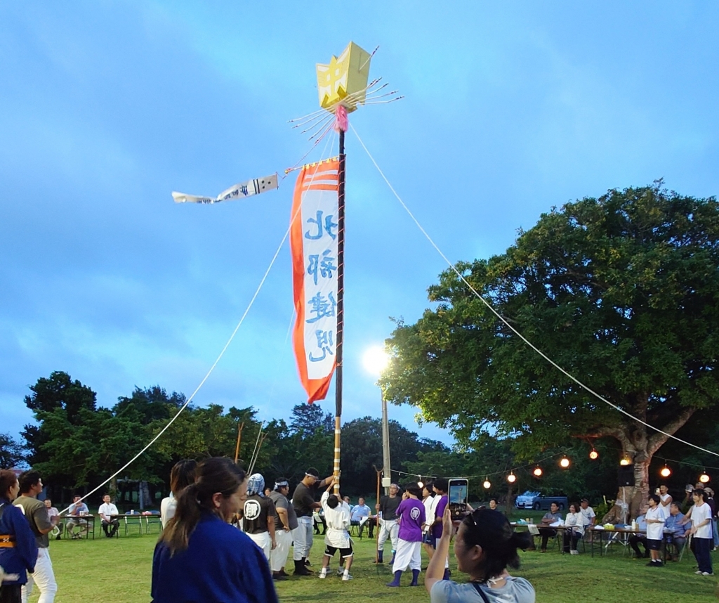 7月27日(土)に開催された伊原間豊年祭に参加し、旗頭を奉納しました。5年ぶりの参加となり、当日は少し風のある中でしたが、地域の旗頭メンバーの皆様のサポートもあり、無事に奉納を終えることができました。 ご指導いただきました、根間建有様、旗頭メンバーの皆様、ありがとうございました。