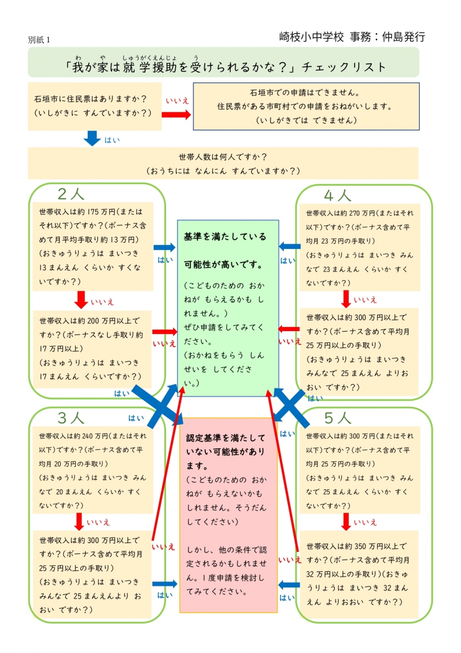 データ内では令和6年度として記載されていますが、新年度も5月にお知らせを配布する予定となっています。の基準になっていますので参考資料としてご活用ください。学校名も崎枝小中学校と記載されていますが、石垣地区で同様の基準になるので石垣小学校も同様の目安で就学援助を受けられることになります。参考にしていただければ幸いです。