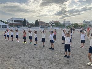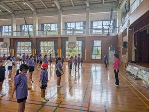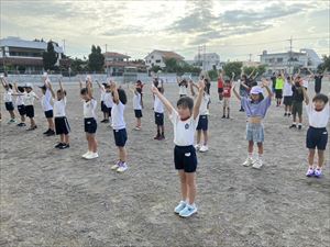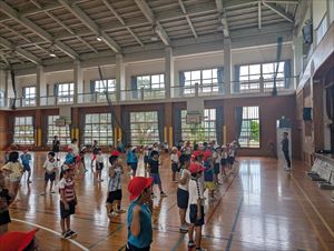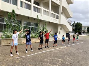 石小っ子の一学期の学校生活も残りわずかとなりました。一学期後半には、夏休みに行われている「ラジオ体操」の指導を体育の時間に外部講師として大底礼子 氏を招いて教えていただきました。現在、毎朝8時に体育委員会が中心となって、運動場でラジオ体操を行っています。