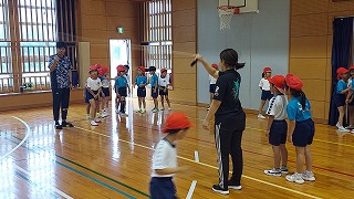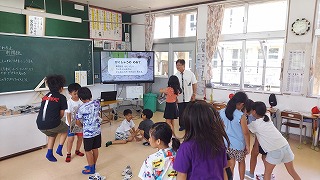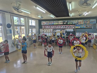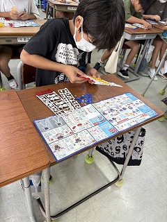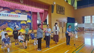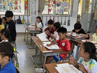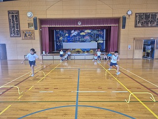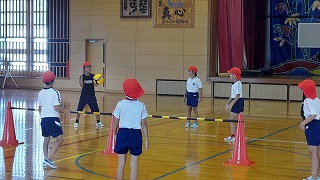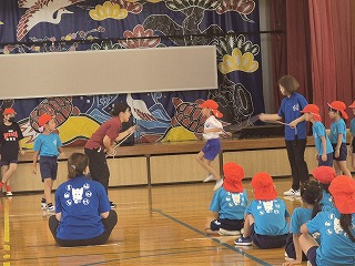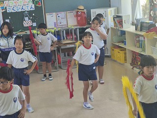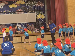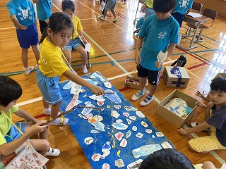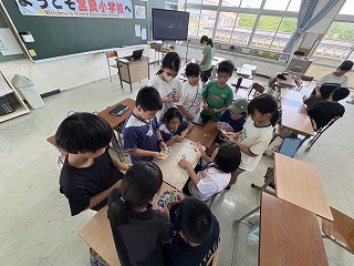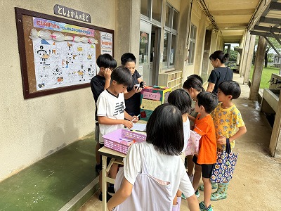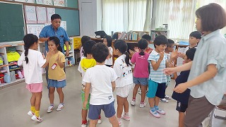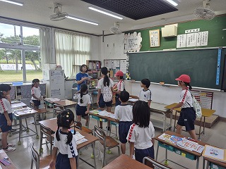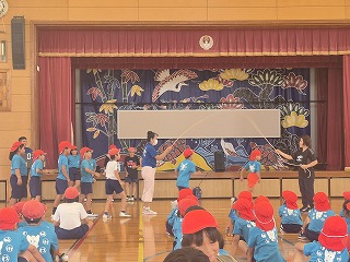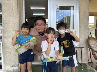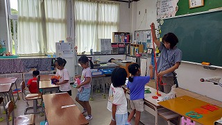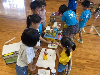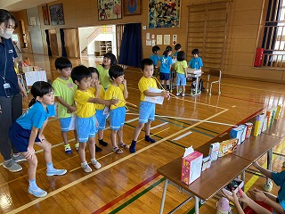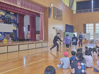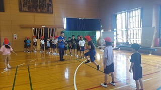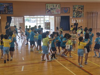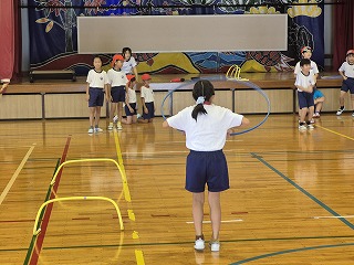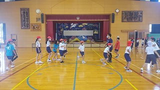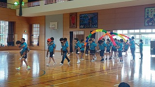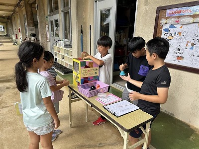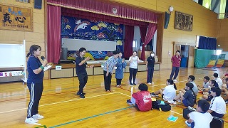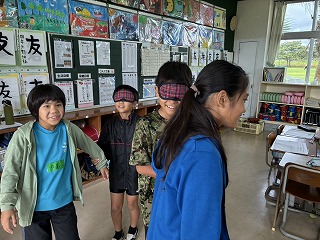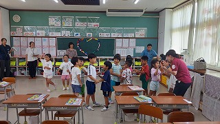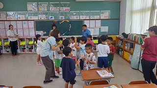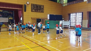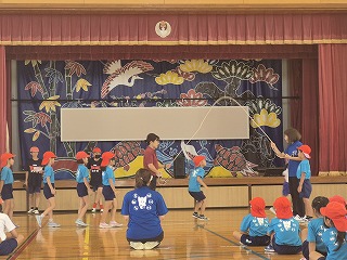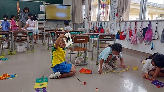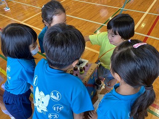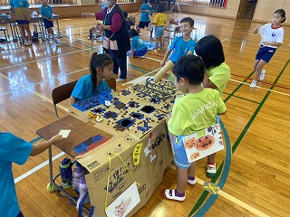 今日は、1・2年生がみやら保育所とみやら子宝保育所の弟・妹を招いて『宮ランド』を開催しました。最初に遊びの説明を行い、じゃんけん列車で自己紹介をした後に1・2年生が計画・制作した色々な遊びを体験しました。仲良く交流する姿がほのぼのしていました(*^_^*)この日のために1・2年生が協力して準備した宮ランドは大成功です!