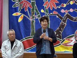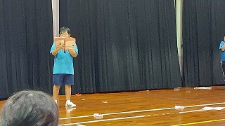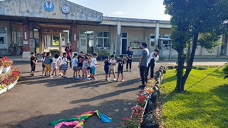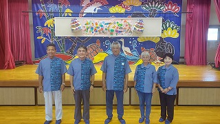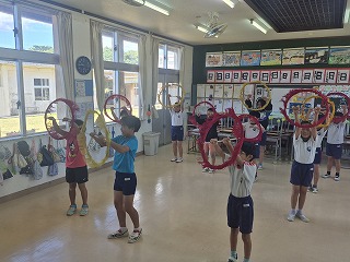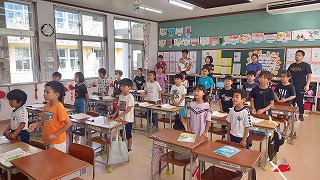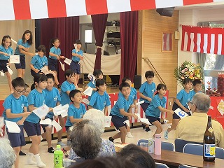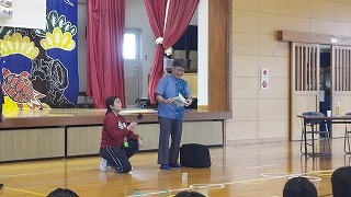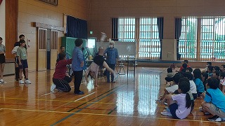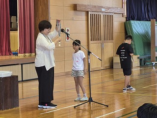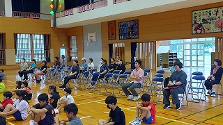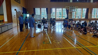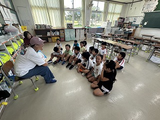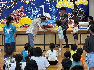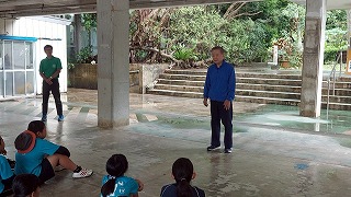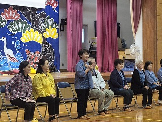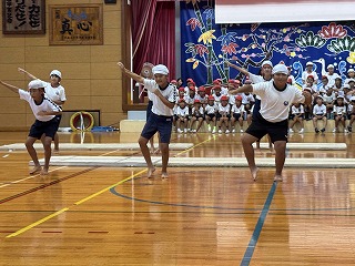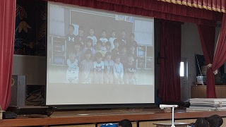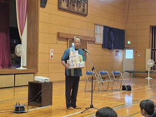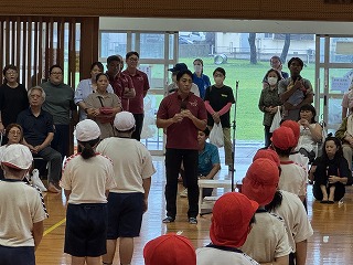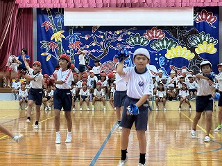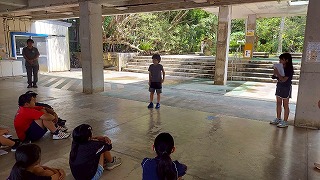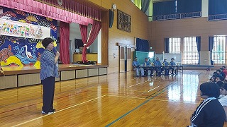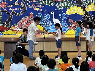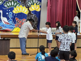 1校時に創立記念集会を行いました。宮良小学校は5月17日で129歳になりました(*^_^*)今日は、『宮良老人クラブ寿会』の前花会長、仲道さん、下地さん、次呂久さん、半嶺さんが来校してくれました。前花会長からは、「今の場所に学校ができたのは65年前」「草だらけ、石ころだらけ」「みんなで石を砕き花壇を作った」「2クラスあり、1組2組ではなく、イ組ロ組という名前だった」など、今の環境とは違う昔の様子を話してくれました。その後は、子ども達に当時の遊びについてお話してくれて、遊びの道具を披露したり、一緒に遊んでくれたりしました。けんけんぱーやゴム跳びを楽しそうに遊んだり、遊んでいる様子を笑顔で見ていました。とても楽しく素敵な時間でした(*^_^*)校長先生からは、当時の話(花壇制作や草刈り、砂を運んで整地等)を聞いて、前花さん達宮小の先輩方みんなで学校を創りあげた様子を知ると、宮小の合い言葉である『知恵出せ 汗出せ 力出せ 豊かな心で創り出せ』の意味が本当によくわかるし、この合い言葉と宮小に対する思いや心のあり方が今の宮小っ子にも引き継がれていると話しました。老人クラブ寿会の皆様のおかげで、すばらしい創立記念集会になりました。寿会の皆様、本日は宮小っ子のためにありがとうございました(^_^)