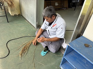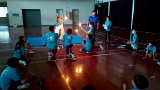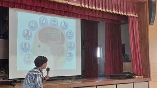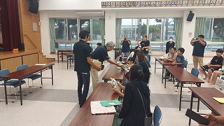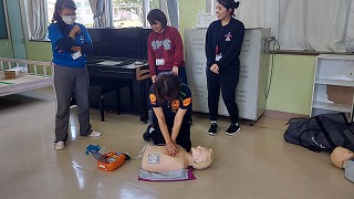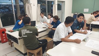 今日は、石垣市消防の黒島さんを講師に、『救命救急』について研修を行いました。これまでに起こった事例を確認後、心肺蘇生(マッサージやAED)、食べ物のつまりの除去等について学ぶことができました。