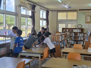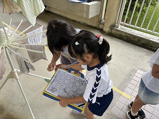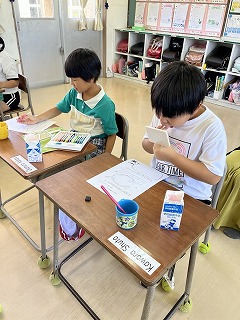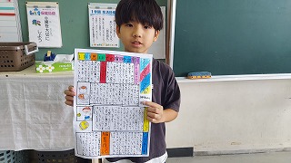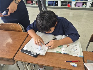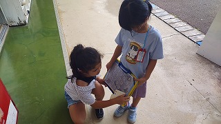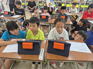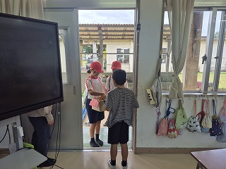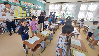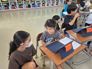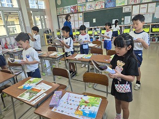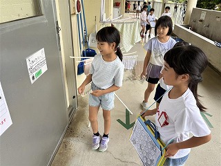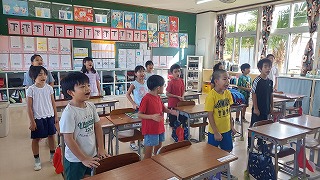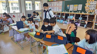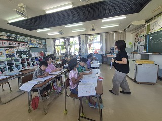2年生のお兄ちゃんお姉ちゃんが、学校の先輩として1年生と一緒に学校探検をしました。学校の色々な場所に出向き、行った場所の名前を確認してワークシートにシールを貼りました。楽しそうな雰囲気で学習する1・2年生でした(^o^)