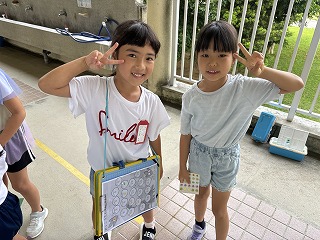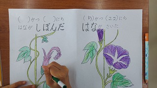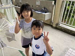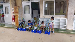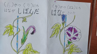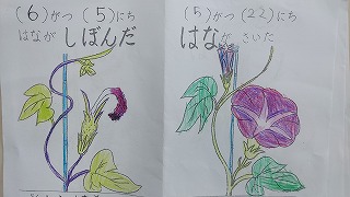 1年生が大事に育てている朝顔がきれいに咲いています(*^_^*)「見て、咲いているよ!」「毎日水かけてるんだよ!」「大きいでしょ(^_^)」と自分の朝顔の自慢をしていた1年生でした(*^_^*)