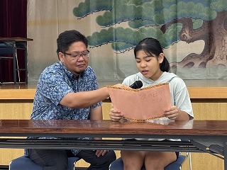 石垣市の栄誉市民で、書の道を極められた茅原南龍氏より、児童生徒のの夢に向かって努力する意欲を高め、郷土の歴史や文化への理解を深めることを願い『茅原南龍自伝「龍が舞う」』を御寄贈いただきました。各クラス文庫への配布と図書館で貸出もできます。