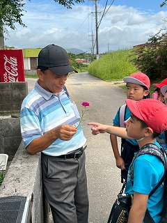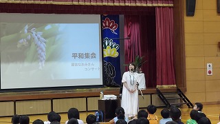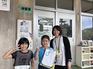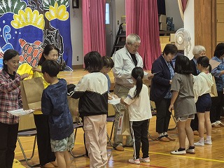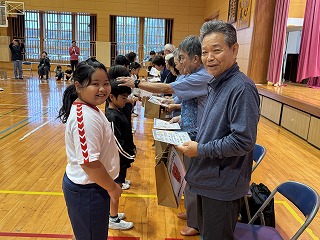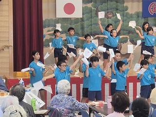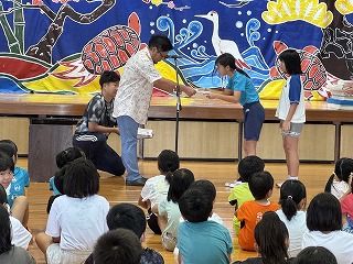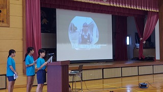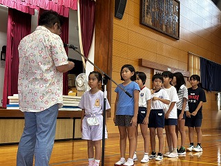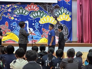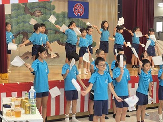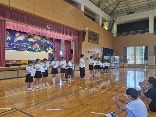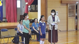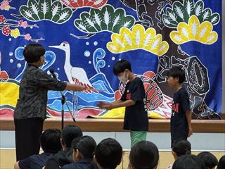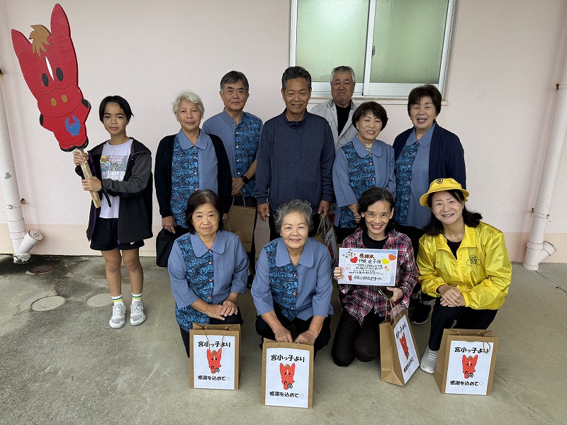 今日は、宮小っ子の登校見守りで日頃からお世話になっている皆さんをお招きして『感謝集会』を行いました。招待者の皆さんから「お父さんやお母さん、おじいちゃん・おばあちゃんにも感謝の気持ちを伝えてみよう。思いは言葉に出すことで相手にしっかりと伝わるよ(^o^)」や「みなさんの、「おはようございます。いつもありがとうございます。ご苦労様です」の言葉がとっても嬉しい(^o^)」「今日は私たちを招待してくれてありがとう!いつもみんなの頑張りを応援しています(^o^)」とお言葉をいただくことができました。会では、児童を代表して仲道はんとさんの感謝の言葉や各学年代表児童による感謝状の贈呈と宮小っ子全員での歌声のプレゼント。そして、栽培委員会さんが準備した”ねぎらう”という意味をこめてネギのプレゼントをしました。宮良老人クラブ寿会の皆様・宮良婦人会の皆様・民生委員の皆様・白保駐在の吉田様、いつも本当にありがとうございます。これからも宮小っ子の見守りを宜しくお願いします。
