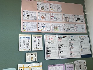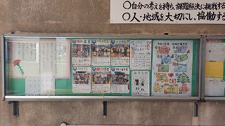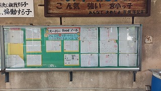 保健室横の壁には大きな掲示板が二つあります。現在は、スーパーGoodノートの掲示と各委員会の紹介、年間行事計画や季節の詩が掲示されています。季節や時期によって掲示内容も変わりますが、子ども達に紹介したいことや伝えたいことなどを計画的に掲示していきたいと考えています(^_^)