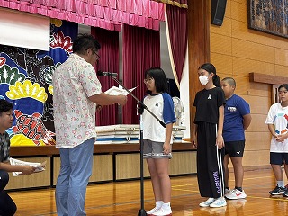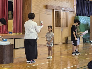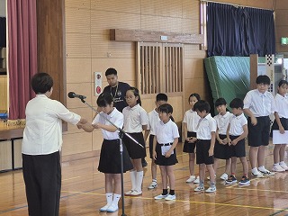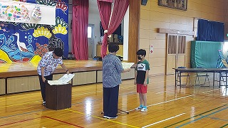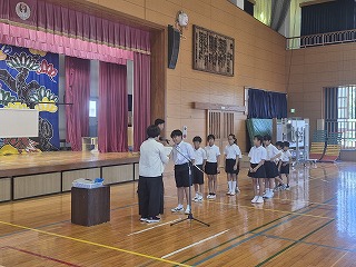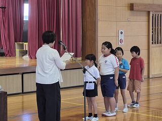 今日の朝集会で、『学級役員認証式』と『生活集会』を行いました。2年生以上の各学級で選出された役員の皆さんを校長先生が認証しました。認証状を受け取る子ども達は緊張感もありましたが、堂々とした表情でした(^_^)役員とクラスメート全員で創りあげるステキな学級になることを期待しています。