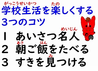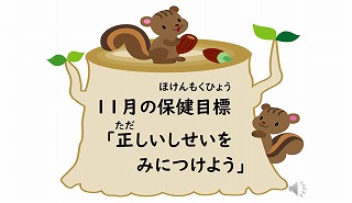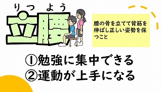 今日の朝の時間は生活集会でした。11月の保健目標は『正しい姿勢を身につけよう』です。そこで今日の集会では【立腰(りつよう)】についてのお話しがありました。正しい姿勢や良い姿勢を保つことで勉強に集中できたり運動が上手になるということでした。姿勢が良くなるだけで???本当に???と疑う人もいるかもしれません。そんな人は、是非立腰を意識して過ごしてみてはいかがですか?もしかすると、すぐに立腰の良さが実感できるかもしれませんよ(*^_^*)
