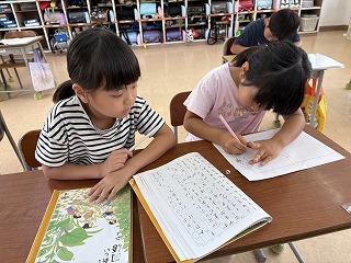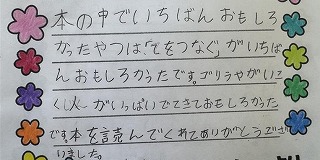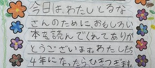 先週金曜日のペア読書のお礼の手紙を低学年から高学年のお兄ちゃん・お姉ちゃんに書いています。数名のお礼の手紙を紹介しますね(#^.^#)また、としょかんこびとの色も大分戻ってきています。早くこびとさんたち全員の色が戻るといいですね( ^)o(^ )
