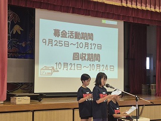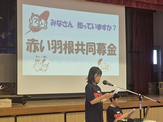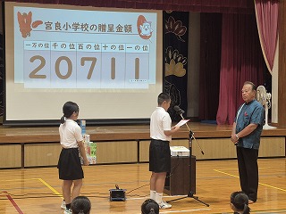 社会福祉協議会の皆さんをお招きして『赤い羽根募金贈呈式』を行いました。宮小っ子の気持ちがあつまった20711円を、世の中の多くの皆さんに役立ててほしいと募金を贈呈することができました。みんなの思いが届き、笑顔があふれる石垣市の役に立てれば嬉しいです(^o^)