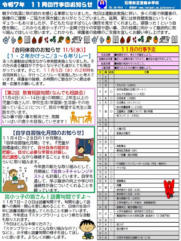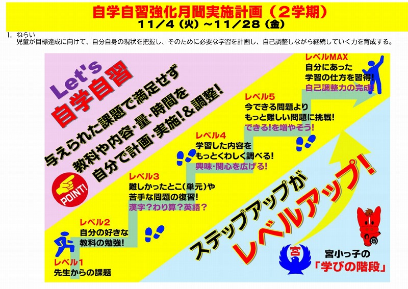 11月は自学自習月間です。宮小っ子1人1人が意欲的に自学自習に取り組むことで、パワーアップ・レベルアップ・笑顔アップになれると信じています(^o^)