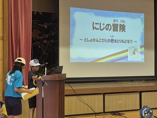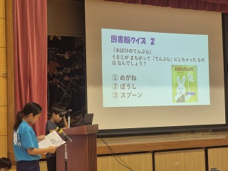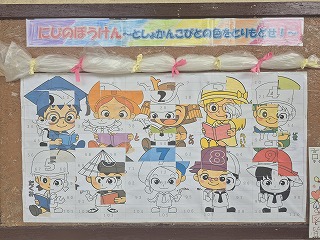 今日の朝の時間は『読書旬間集会』でした。読書旬間の取り組みや読書クイズがありました。旬間取組の目玉は、【スタンプラリー(にじの冒険~としょかんこびとの色をとりもどせ!!~】です。スタンプラリーをクリアして色のかけらをGETして色がなくなったこびとに貼り付けて、色を復活させる取組です。スタンプラリーのミッションも面白いミッションがたくさんです(*^_^*)楽しみながら本にふれ合い、多くの本と出会ってほしいです!