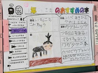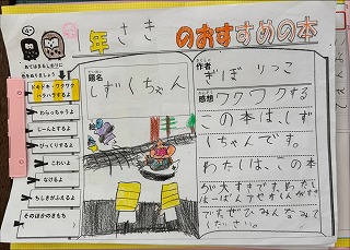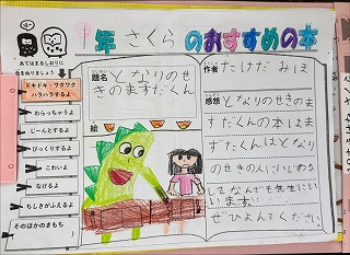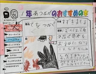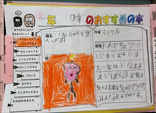 読書旬間の取組の一つに『わたしのおすすめの本の紹介』があります。1年生も頑張って本の紹介を作成しているので紹介します(^o^)みんな上手に紹介することができていてスゴいです(*^_^*)