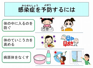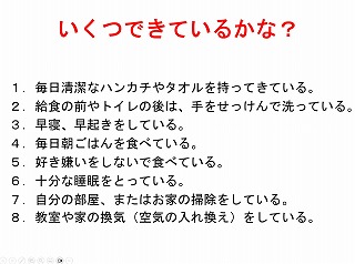 今日は生活集会がありました。集会の前には落とし物についての話がありました。持ち物に記名がないため落とし主がわからない落とし物があります。自分の持ち物にはしっかりと記名をお願いしますね。12月の生活目標は生活目標は「時間を守り考えて行動しよう」、保健目標は「感染症を予防しよう」です。そこで、今日の生活集会では、感染症予防についてお話しがありました。新型コロナやインフルエンザ、風邪などの感染症を予防するために自分でできることを確認しました。また、寒くなってきて窓を開けるのがイヤになるかもしれませんが、しっかり換気することも必要になってきますね。でも、もし感染症に罹ってしまっても心配しないで早く治るようにしっかり休みましょう(*^_^*)元気になるまでしっかりと休み、その後に元気に登校しましょうね(*^_^*)