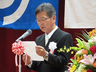 第一部は記念式典です。これまでにご尽力いただいた歴代の校長先生や明石小学校に功労いただいた方々、今回の70周年に合わせて高額な寄付をいただいた方々への表彰があったり、石垣市長 中山義隆様をはじめ、石垣市教育委員会教育長 崎山晃様や八重山教育事務所所長 前三盛敦様など多くの方々よりお祝いのご挨拶をいただいたりしました。