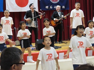 後半には卒業生でもあり、歌手でもある宜保和也さんの70周年スペシャルソング「みんなのアカシ」を一緒に歌わせていただく時間も。明石っ子みんなで考えた断片的な歌詞を和也さんが構成を考えてステキな曲へと仕上げてくださいました。校長先生はギターで、3・4年担任の初妃先生はピアノで参加!かっこよかったです。