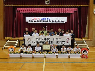 第一部は記念式典です。これまでにご尽力いただいた歴代の校長先生や明石小学校に功労いただいた方々、今回の70周年に合わせて高額な寄付をいただいた方々への表彰があったり、石垣市長 中山義隆様をはじめ、石垣市教育委員会教育長 崎山晃様や八重山教育事務所所長 前三盛敦様など多くの方々よりお祝いのご挨拶をいただいたりしました。