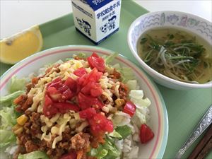 タコライス レタスと豆苗のスープ グレープフルーツ 牛乳
