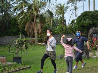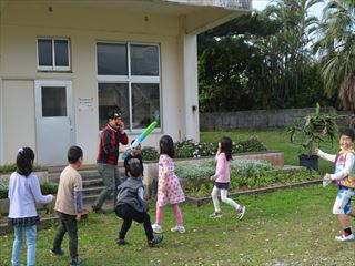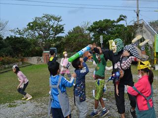 鬼が三匹現れて、子ども達は豆(落花生)を投げつけて追い払いました。