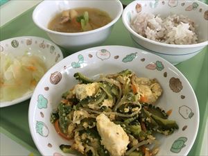麦ごはん ゴーヤーチャンプルー とり汁 牛乳