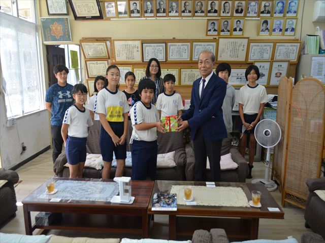 ★6日に5,6年生代表で赤い羽根共同募金贈呈式に参加しました。 ★8日に行われた創立記念集会では、学校の用務員である山城八重子さんに