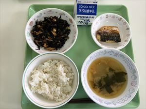 麦ご飯 焼きサバ ひじき炒め みそ汁 牛乳