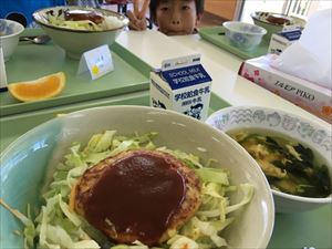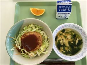 ロコモコ丼 レタスと小松菜のスープ オレンジ 牛乳