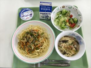 バジルスパゲッティー 野菜サラダ にら玉スープ ヨーグルト 牛乳