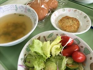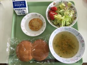 パン 豆腐ハンバーグ 野菜サラダ コーンスープ 牛乳