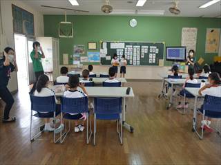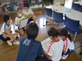 果物や動物、色などを英語で発音したり、グループで話し合ってなぞなぞを考えたり、曲に合わせてジェスチャーしたり。