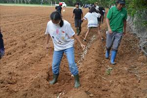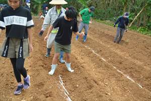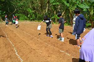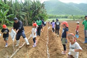 サトウキビがたくさん実るように、キビ苗を間隔は開けず、重ねるように置いていきます。その後肥料と虫除けの薬をまいて…