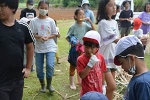 サトウキビの葉っぱを取り除き… 午後からこども達のキビ植え体験がスタート!