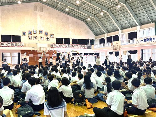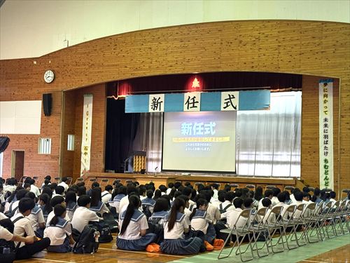 まずはじめに、新任式が執り行われ、新たに19名の教職員を迎えました。 生徒会の皆さんが「花道」を作って新職員を歓迎!生徒会長の宮里さんより歓迎の言葉をいただくなど、学校全体が温かい雰囲気に包まれた、素敵な出会いのひとときとなりました(^^)/