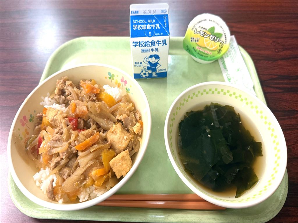 今日のメニューは「豚丼・わかめスープ・レモンゼリー・牛乳」です♪