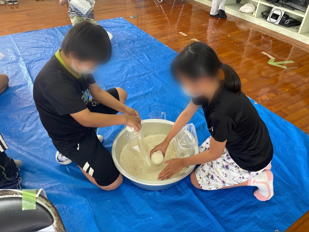 小学部では、お米の袋詰め作業を行いました。