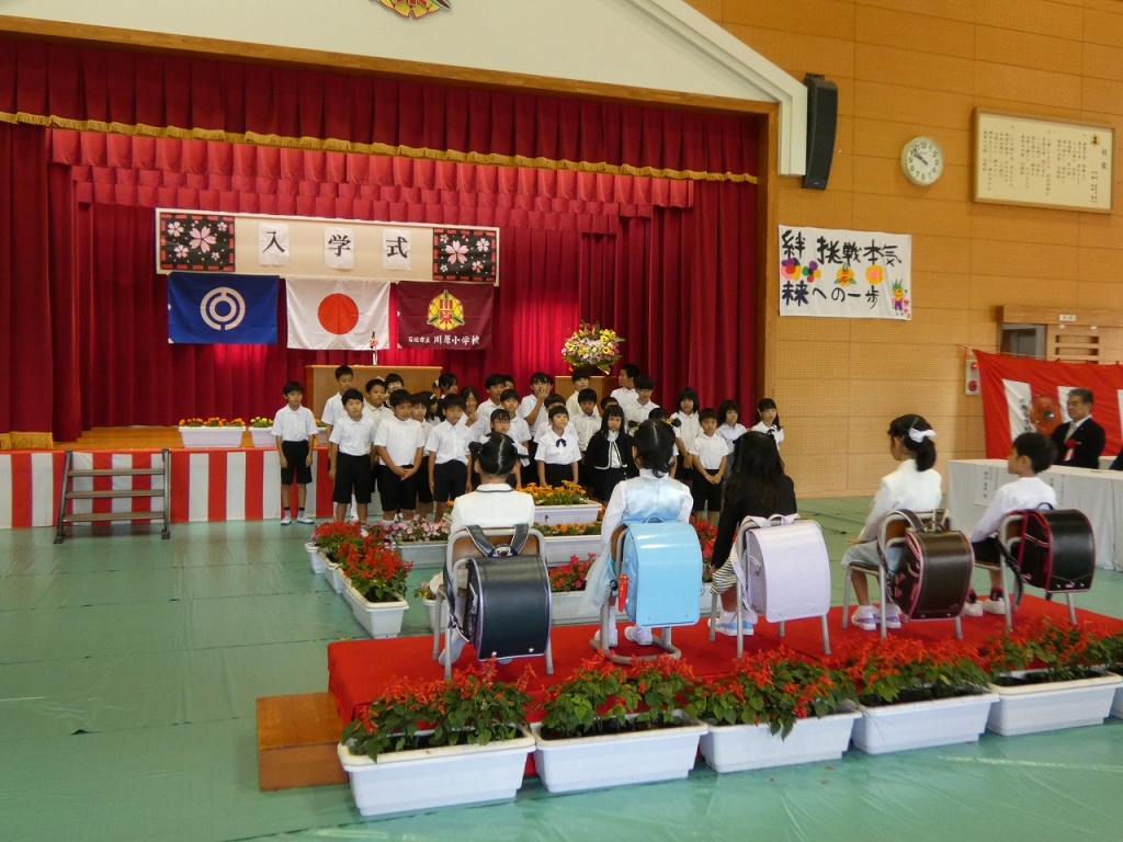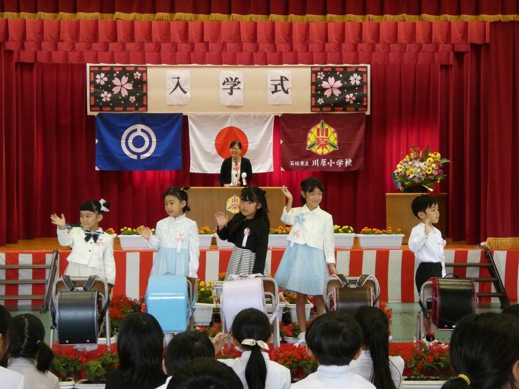 今年度も5名のかわいい新入生が川原小学校に入学しました。入学式では、ご家族やPTA、地域の方々、在校生、教職員に見守られながら2年生と一緒に「ドキドキドン1年生」をかわいく踊ることができました。