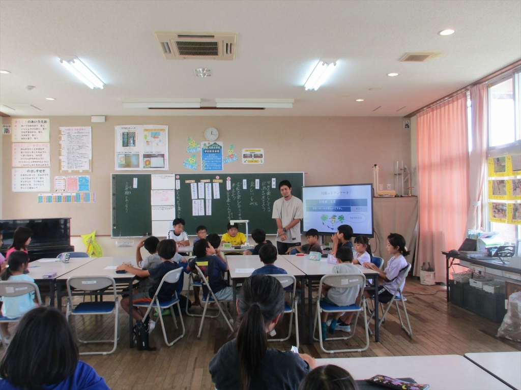 今日の授業では、川原地区で農家を営む森井さんを講師にお招きして「野菜が育つ土」について講話をして頂きました。いい土とは?川原小学校でいい土をつくるためには?など様々な視点から、子どもたちにもわかりやすく説明をして下さりました。