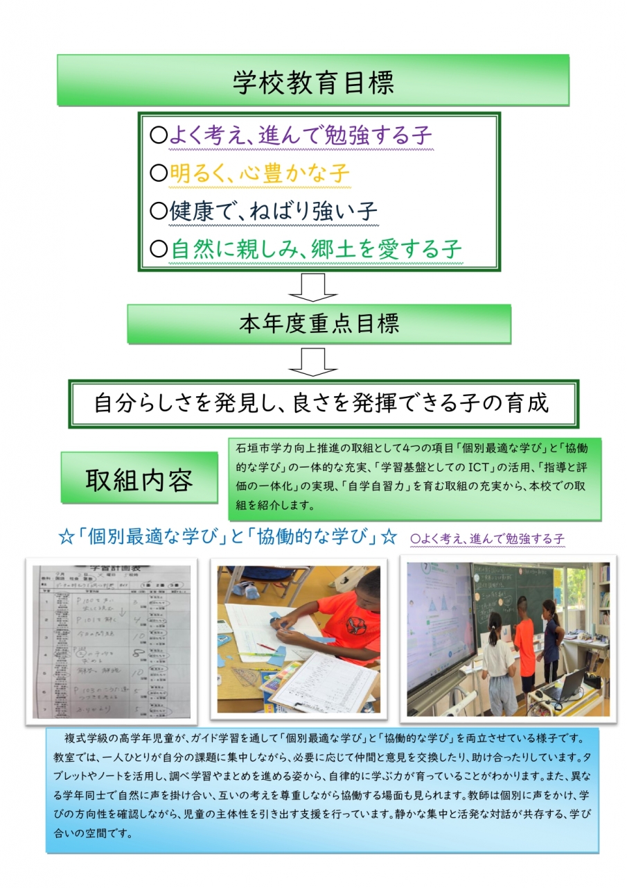 石垣市立野底小学校では、学校教育目標「よく考え、進んで勉強する子」「明るく、心豊かな子」「健康で、ねばり強い子」「自然に親しみ、郷土を愛する子」を基盤に、児童一人ひとりの学びを大切にした取組を進めています。