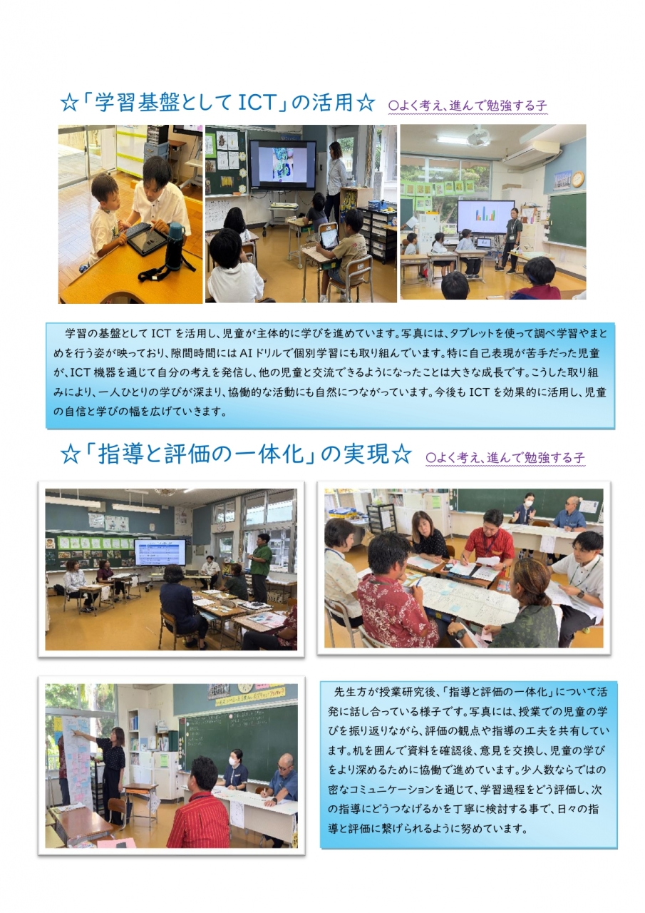 今年度は、「個別最適な学び」と「協働的な学び」の充実を柱に、ICTの活用や指導と評価の一体化、自学自習力の育成に力を入れています。複式学級では、タブレットやノートを活用しながら、自分の課題に集中しつつ仲間と意見を交換する姿が見られ、主体的に学ぶ力が育っています。