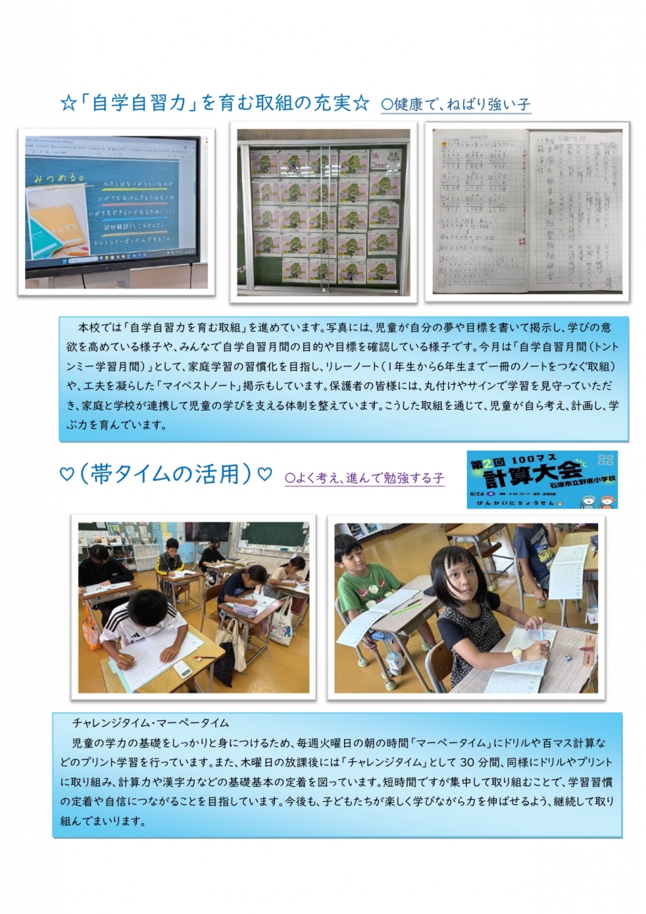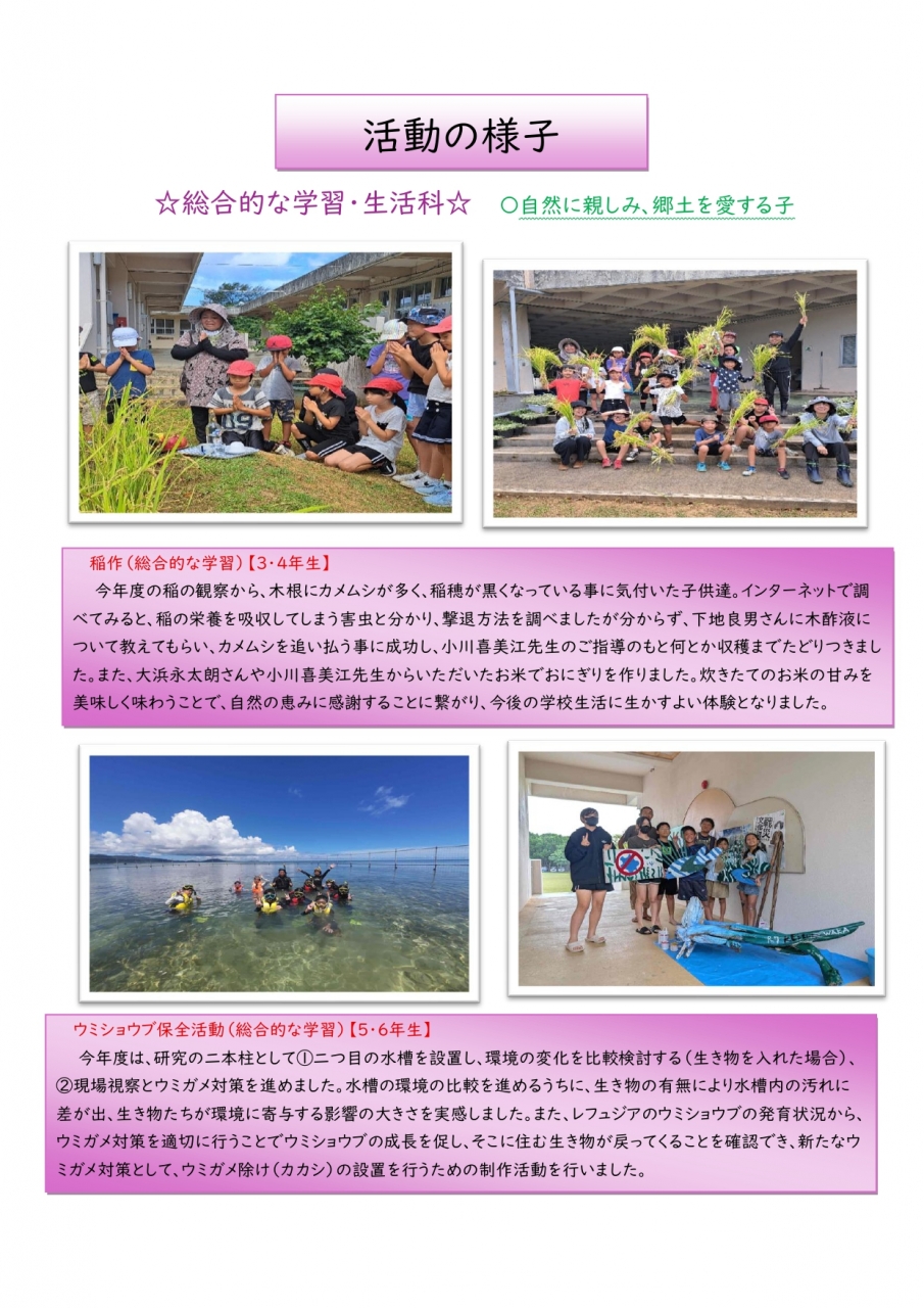 また、ICTを活用した調べ学習やAIドリルによる個別学習「チャレンジタイム」「マーペータイム」など基礎学力を高める時間を設け、学習習慣の定着を図っています。さらに、総合的な学習では、ウミショウブ保全活動や稲作体験を通して、自然や郷土への理解を深めています。