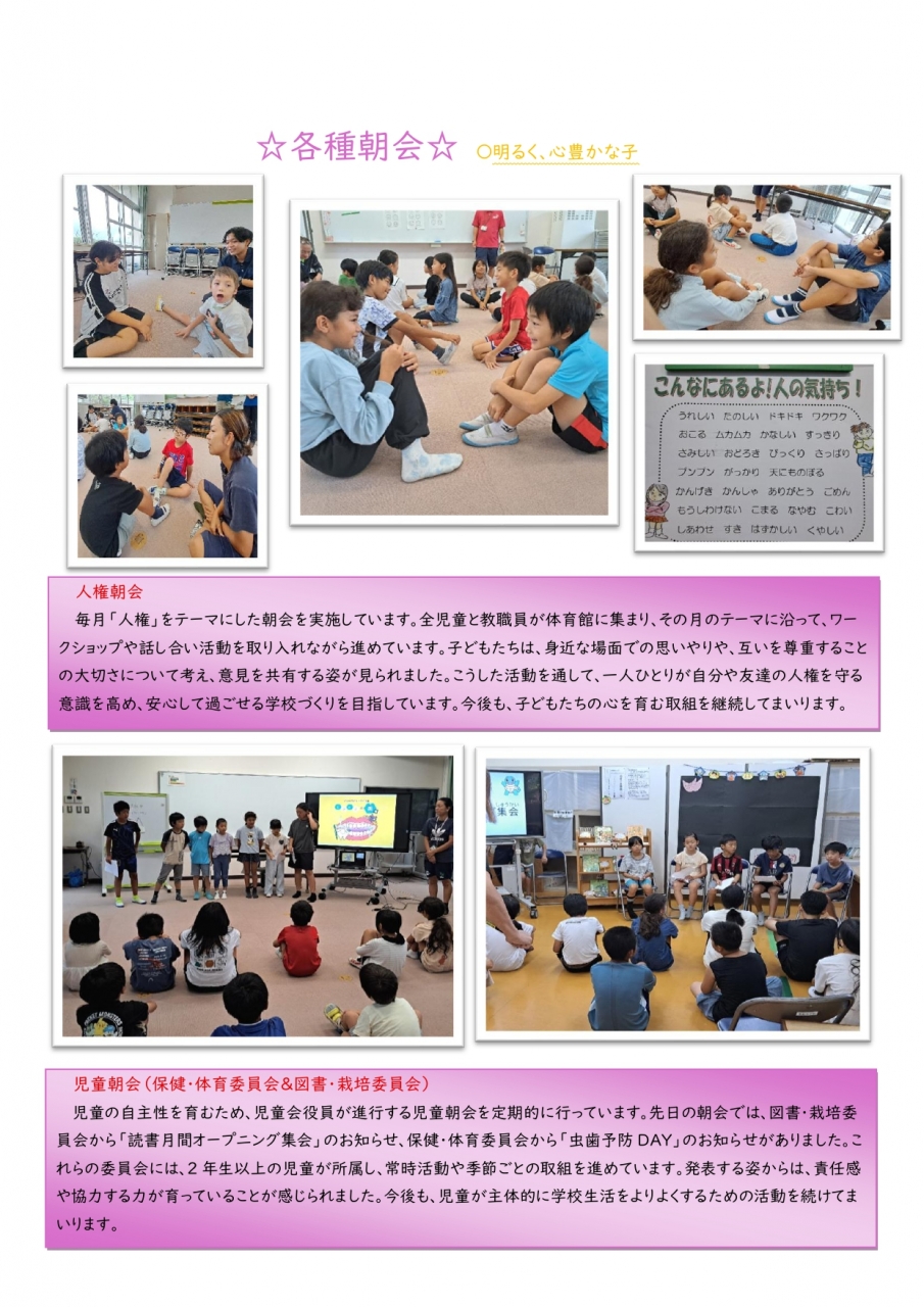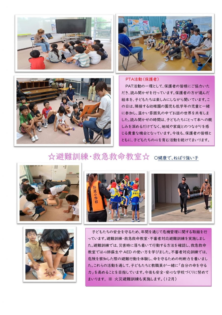 心を育む活動としては、読み聞かせや人権朝会、児童会活動を継続し、思いやりや協力する力を養っています。安全面では、避難訓練や救急救命教室を実施し、命を守る力を高めています。