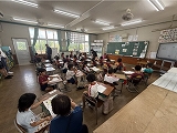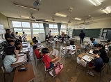 この日は地震後、津波警報が発令されたことを想定しての避難訓練を行いました。低地にある本校は、避難場所の大浜中学校まで走って逃げなければ、津波到達時刻に間に合わないことも考えられます。細い路地を抜け国道を渡らなければならないため、車にも十分注意をする必要があります。子ども達は安全を確認しながら必死に走り、全員が無事に大浜中学校体育館二階ピロティ―まで避難することができました。保安要員として協力してくださった保護者の皆さま、ありがとうございました。