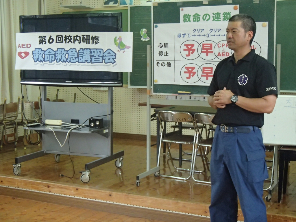 6月1日(水)、今日は水泳学習が始まるということで、消防署から大道勇樹さんを招いて救急法実技講習を行いました。心肺蘇生までの流れやAEDの実技講習、ハブや海の危険生物の対処法についても教えて頂きました。