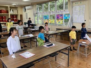 今週月曜日に音読朝会がありました。音読活動は、本校が長年継続してきた特色ある教育活動の一つです。今月の詩の発表から、1年生も元気よく参加しました。後半は4,5年生による音読発表。とても上手に音読することができました。写真は、みんなでお口の体操をしているところです。