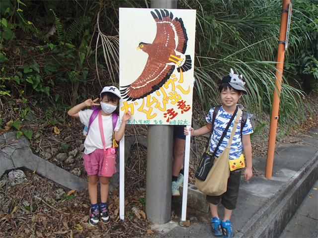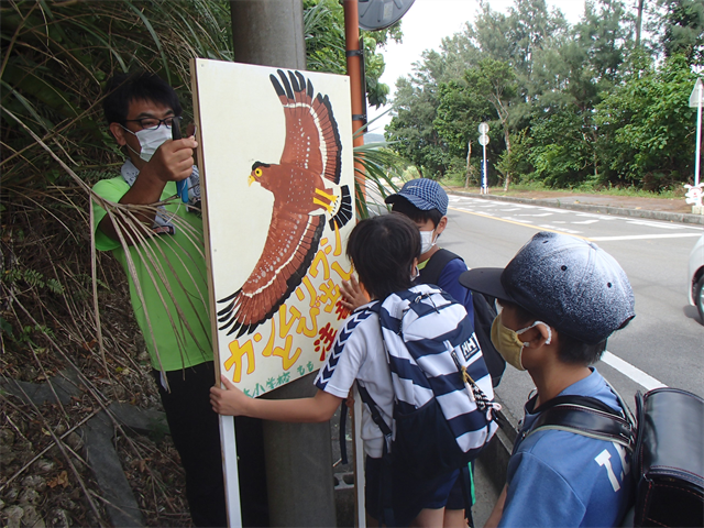 学校の前の道路ではカンムリワシの