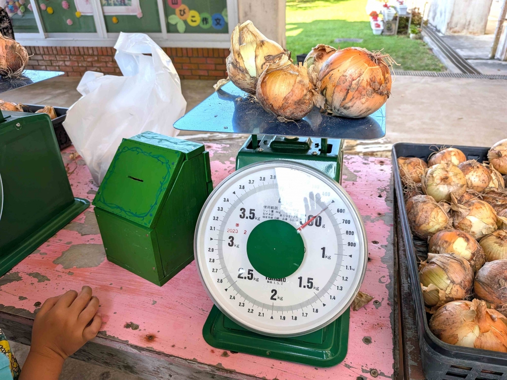 先週収穫した玉ねぎを袋詰めして、県道沿いで販売しました。なんと2時間で8袋売れ、子供たちは大変喜んでいます。