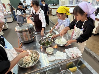朝早くから地域の方のご指導の下5・6年生が家庭科室で朝ご飯を作り、7:30から食べに来る