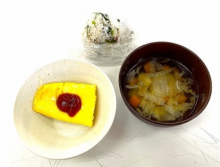 この日のメニューは、ご飯、人参とタマネギとキャベツのみそ汁、玉子焼、茄子のみそ和えでした。