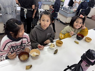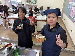 朝早くから地域の方のご指導の下5・6年生が家庭科室で朝ご飯を作り、7:30から食べに来る